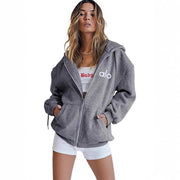 Alo Women's Personality Print Zip-Up Hoodie Loose Casual Long Sleeve Hooded Sweatshirt Sporty Style