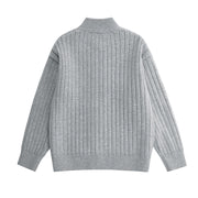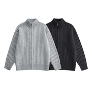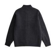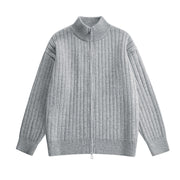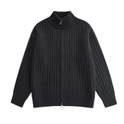 Loose Knit Cardigan for Men with Stand Collar and Solid Color Ribbed Design