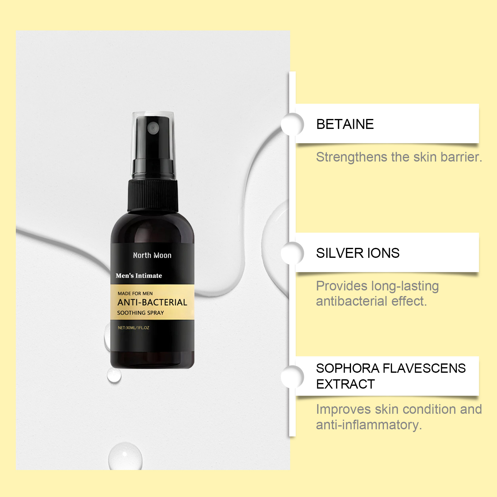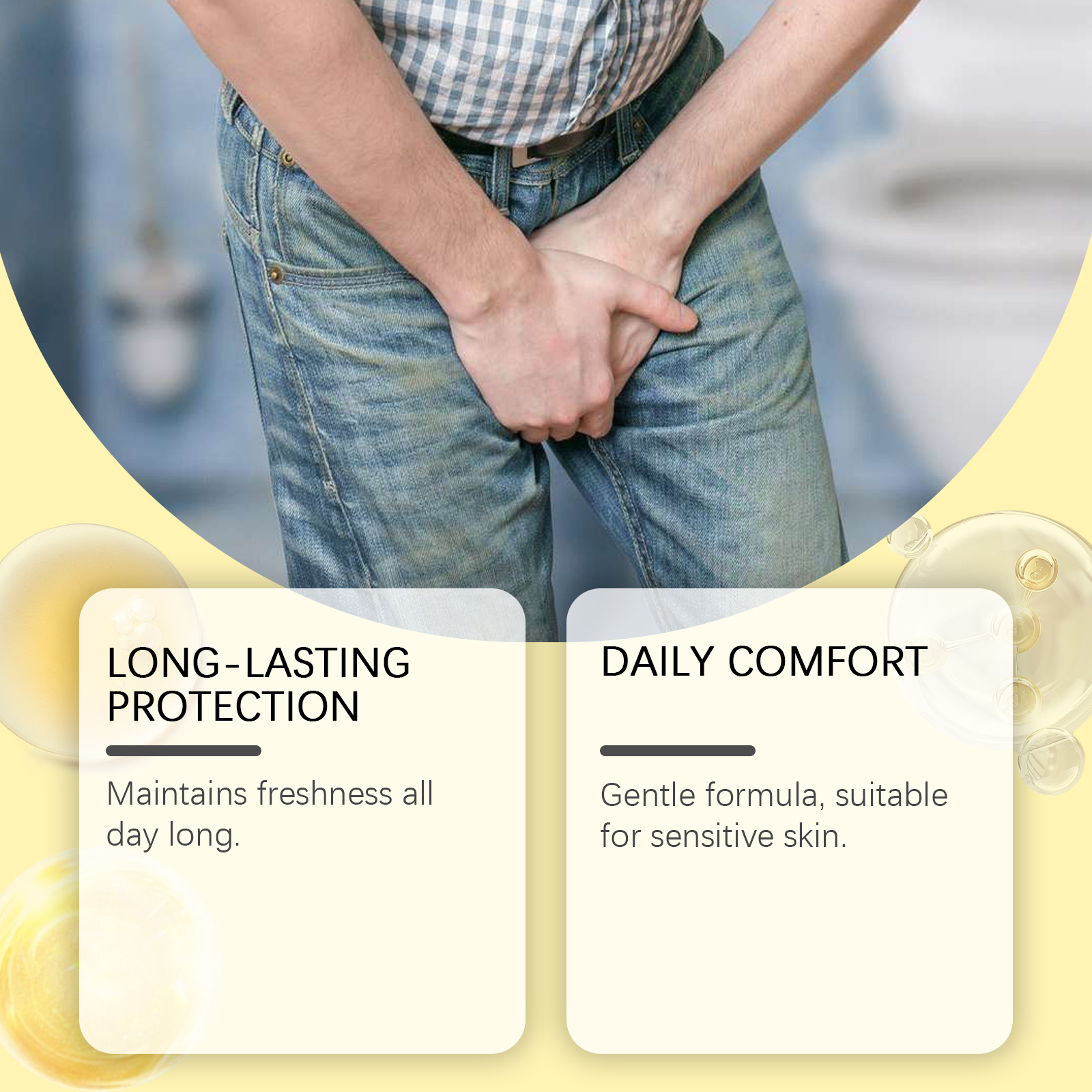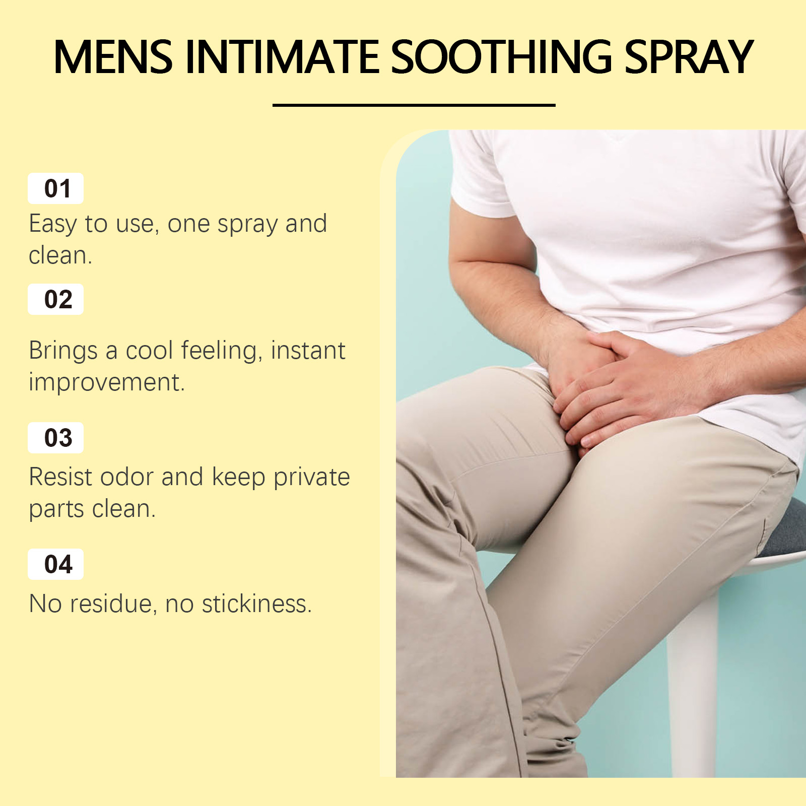 Our men's body care spray contains deionized water, silver ions. It can stay fresh all day long. Mild formula, suitable for sensitive skin. Its use method is very simple: clean the private parts and keep dry, spray the right amount of this product evenly on the private parts, waiting for it to be absorbed. And can be instant refreshing, lasting effect.