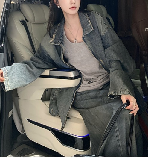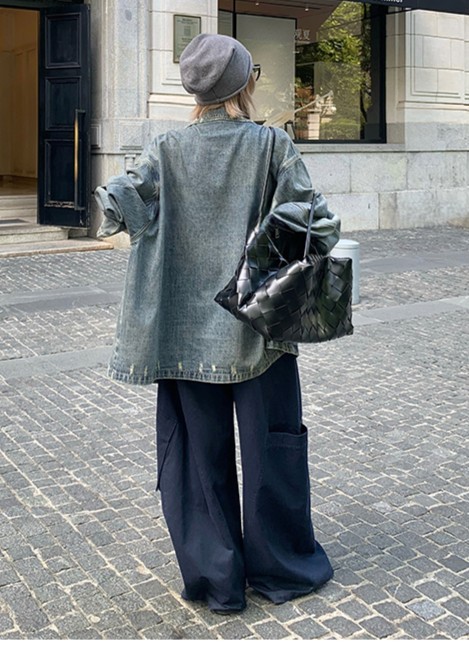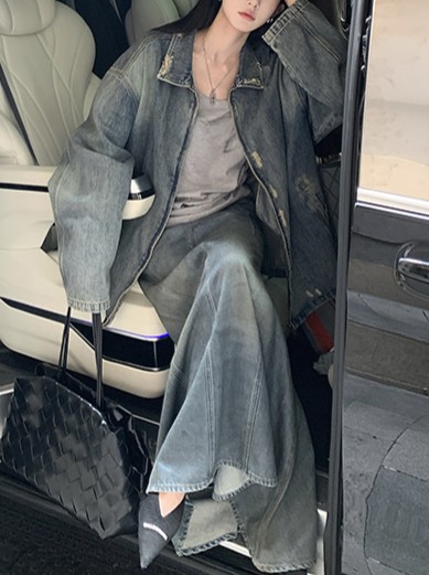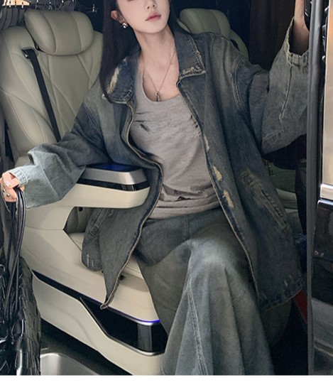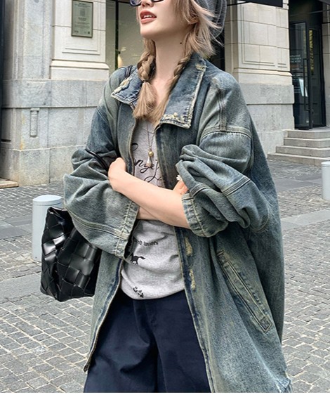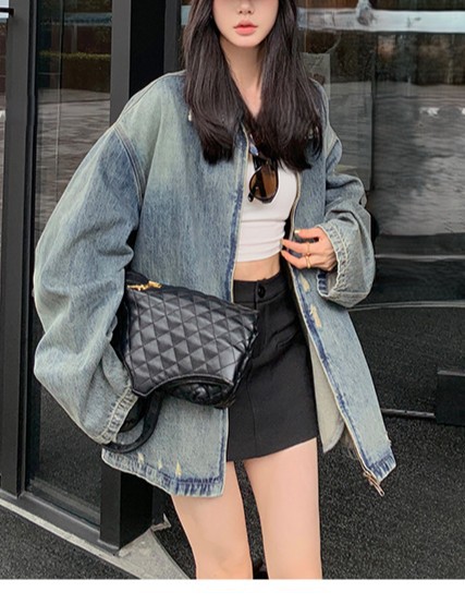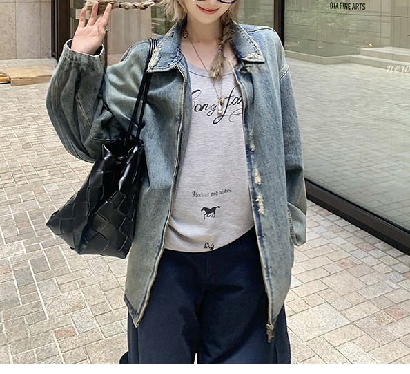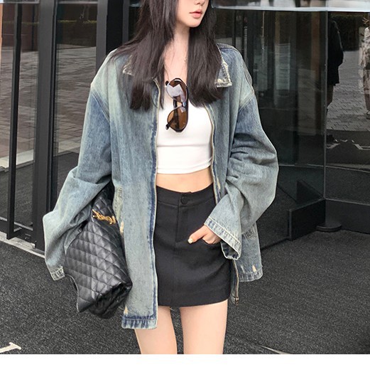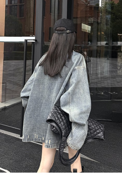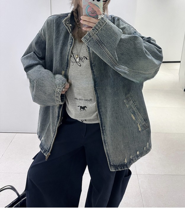 区区欧阳 做旧磨破牛仔外套女秋季新款休闲宽松美式复古夹克上衣